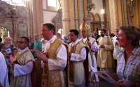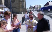Niezwykły w wydarzenia była wyjazd do Paderborn. Znajduje się tam najstarsza i najważniejsza świątynia miasta pw. Najświętszej Maryi Panny i Świętych Liboriusza i Kiliana, która pełni funkcję katedry od 799 roku. Od 1929 roku jest onasiedzibą arcybiskupstwa. W katedrze nasza młodzież uczestniczyła we Mszy św., którą dla dzieci i młodzieży z Paderborn sprawował ks. bp Matthias König. Wśród koncelebransów był też „nasz” ks. Jan Rajczakowski oraz znany nam z ŚDMowych spotkań w Legnicy i w Rahrbachks. Reinhard Lenz z Freudenbergu. Po Eucharystii wszyscy uczestniczyli w wielkim festynie z różnymi atrakcjami. Dzięki uprzejmości i staraniom Gospodarzy oraz ks. Reinharda Lenza kamiennogórska grupa została przyjęta przez bpa Matthiasa i ugoszczona w jego siedzibie.